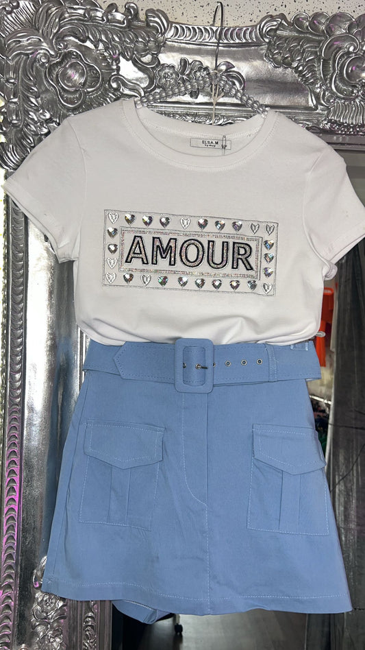 Amour White Graphic Tee and Baby Blue Mini Skort With Belt Set